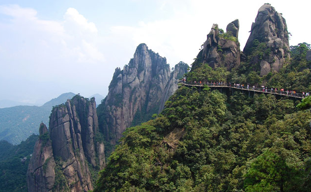 换乘索道(报价已含)登上【三清山】(游览300分钟)西海岸:高空栈道、云海、山盟海誓、观音送子等;阳光海岸:五老拜三清、渡仙桥、步云桥等;南清园:巨蟒出山、司春女神、生死相依、一线天等,游毕下山,入住酒店