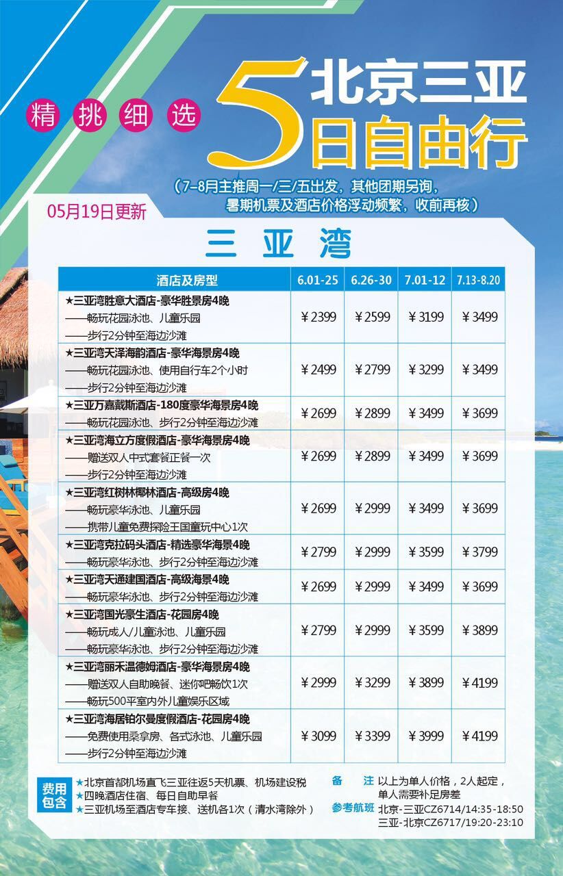 - 费用包含 1、北京至三亚往返机票及机场建设燃油附加税;