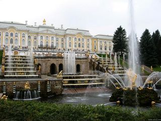 夏宫,俄罗斯夏宫又称彼德宫,坐落在芬兰湾南岸的森林中,距离市区29公里。它始建于1714年,分为上花园和下花园,大宫殿(外观)在上花园。这里的建筑豪 华壮丽,被誉为“俄罗斯的凡尔赛”, 大宫殿前是被称作大瀑布的喷泉群。这里有37座金色雕像,29座潜浮雕,150个小雕像,64个喷泉及两座梯形瀑布。在喷泉群一个大半圆形水池的中央,耸 立着大力士参孙和狮子搏斗的雕像,这就是著名的隆姆松喷泉。塑像高3米,重5吨。